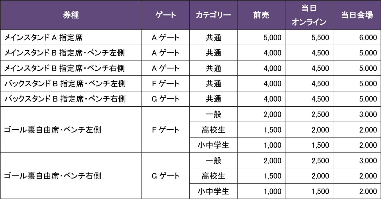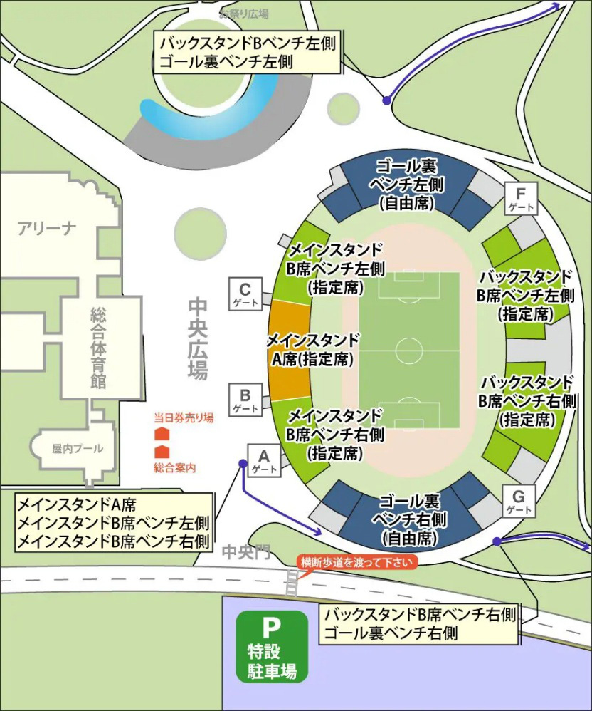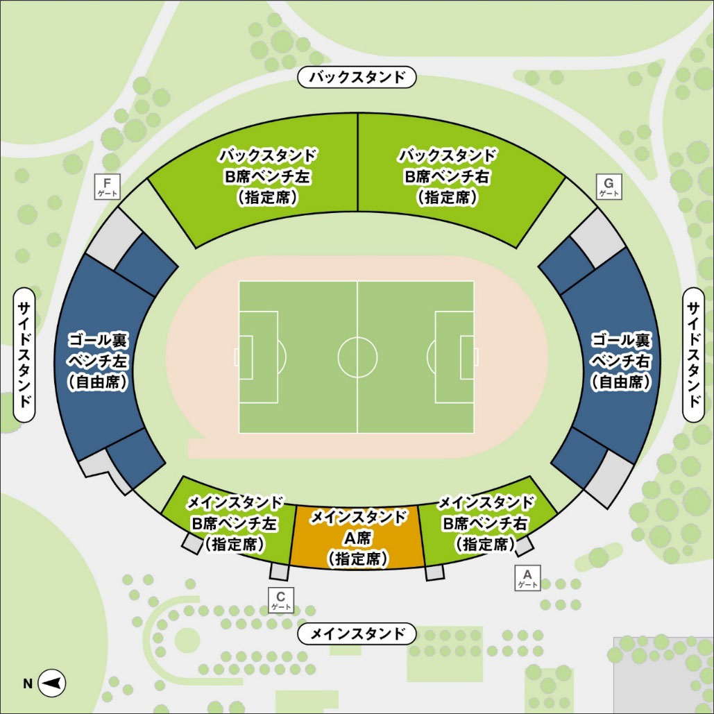 Gゲート…ゴール裏ベンチ右(自由席)、バックスタンドB席ベンチ右(指定席)