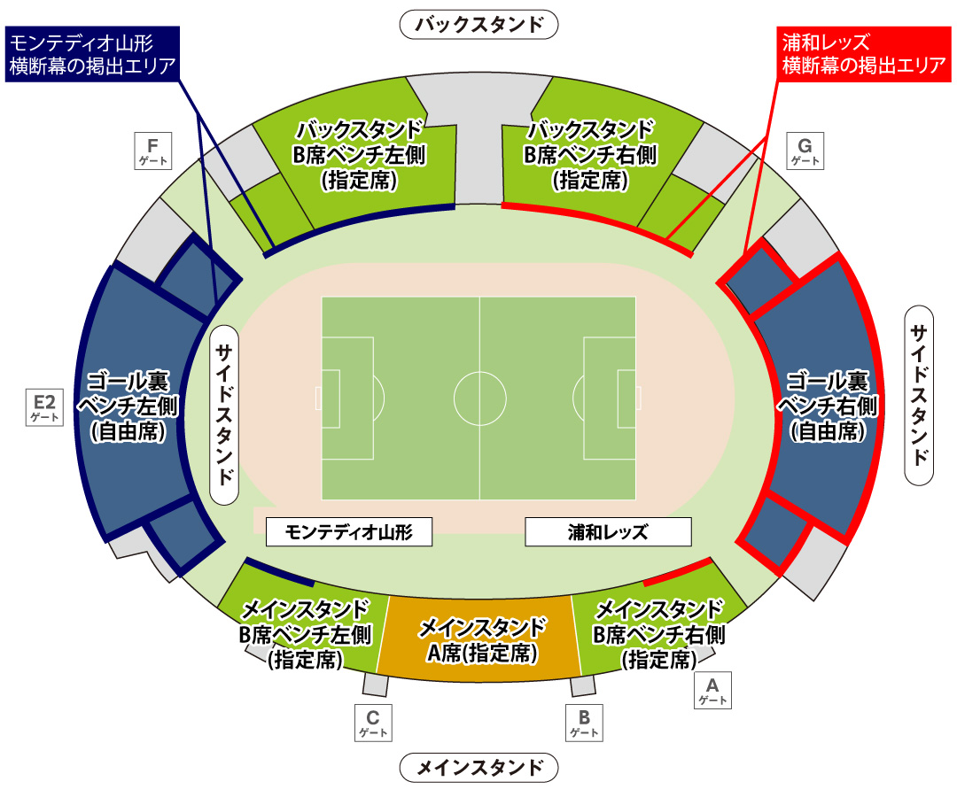 バックスタンドB席ベンチ左、ゴール裏ベンチ左はモンテディオ山形の応援席です。浦和レッズの応援(応援グッズの着用を含む)はできません。