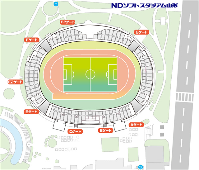 試合開催時は、特設駐車場をご利用ください。山形県総合運動公園内に設置されている北駐車場・南駐車場・西駐車場は他大会利用者の利用により満車になる場合があります。