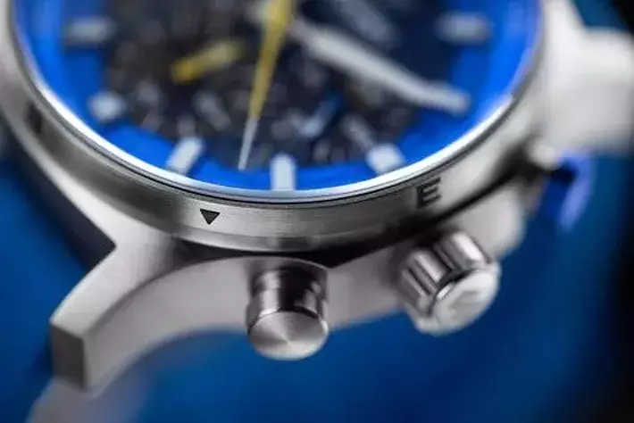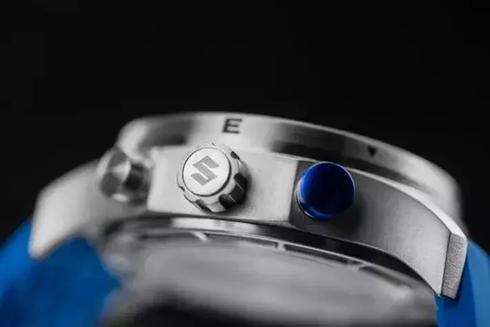 SUZUKIロゴをあしらったねじ込み式リューズは、リューズガードとともに高い防水性能と耐久性を実現。さらに、SUZUKI CN Challengeを象徴するブルーでカラーリングされたクロノグラフボタンは、視認性を重視したデザインとなっています。特にスタート/ストップボタンには、印象的なスズキブルーを採用し、機能性とデザイン性を融合させています。