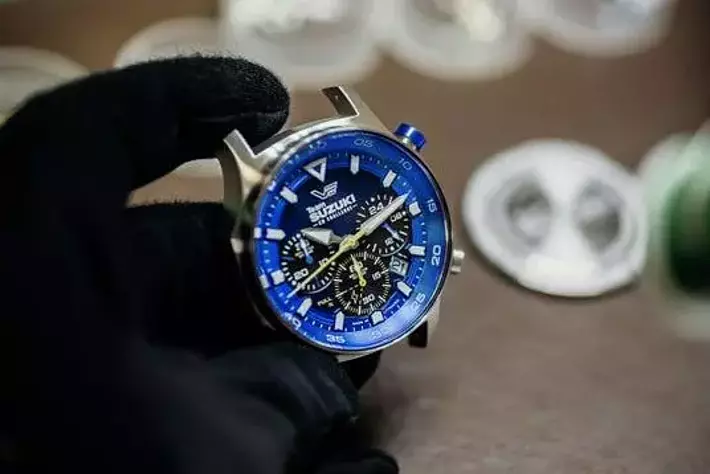 SUZUKIロゴの入ったねじ込み式リューズ、色分けされたクロノグラフ