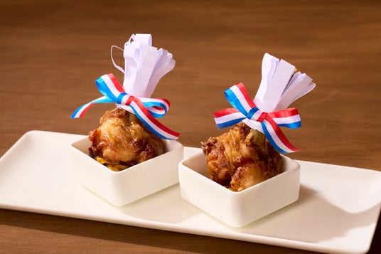若鶏の手羽元をチューリップ型に仕立て、醬油やショウガ、ニンニクで下味をつけ香ばしく揚げました。昭和のお祝いの席や行楽のお弁当を彩った、懐かしのおかずです。