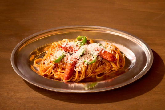 甘酸っぱいトマトソースで、赤いウインナーやピーマン、マッシュルーム、玉ねぎを炒め、昭和の喫茶店の定番メニューを再現しました。