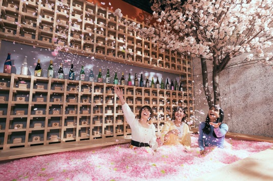 全身桜の花びらに埋もれて記念撮影をしたり、膝まで桜の花びらに埋もれながら佐賀酒を楽しむことができます。