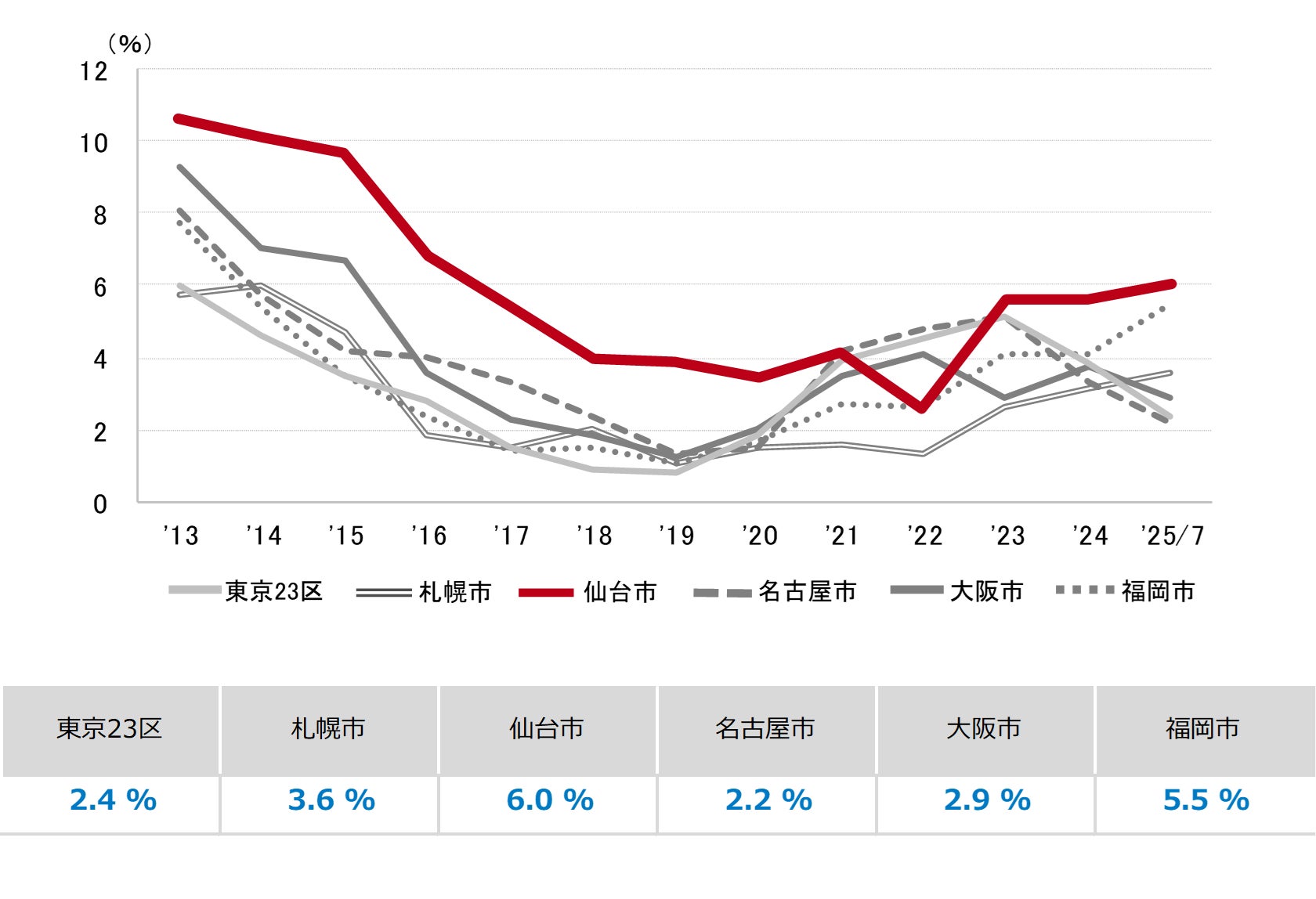 三幸エステート株式会社(本社:東京都中央区、取締役社長:福島正二郎)は、2025年7月度の仙台市オフィス賃貸状況(空室率&現空面積:全規模、募集賃料&募集面積:全規模、規模別空室率、主要エリア※1空室率:全規模)および全国6大都市(東京・札幌・仙台・名古屋・大阪・福岡)の大規模ビルのマーケットデータをまとめた「オフィスマーケット2025年8月号仙台」を公表します。
