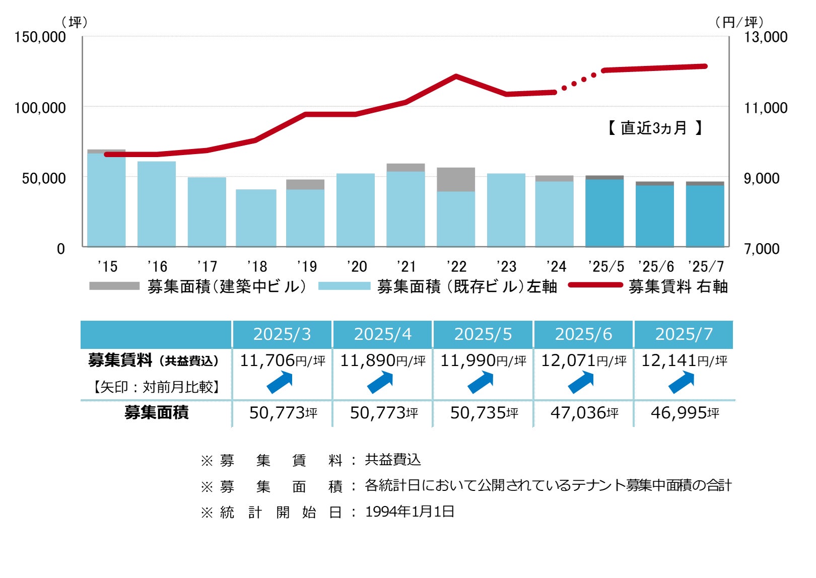 募集賃料は前月比プラス70円/坪の12,141円/坪となり、9ヵ月連続の上昇となった。一部のビルでは新規募集の賃貸条件を従前より引き上げる動きが見られる。