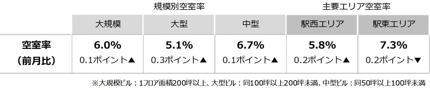 空室率は前月比プラス0.15ポイントの6.14%となり、3ヵ月連続で小幅な上昇となった。集約移転により生じた空室や、新築ビルに移転したテナントの二次空室が現空となり、主な上昇要因となっている。潜在空室率は前月比プラス0.04ポイントの7.36%だった。