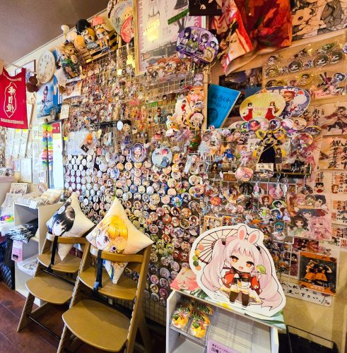 また店内には、”ひなビタ”や、全国各地の”温泉むすめ”などのご当地キャラクターのグッズが、壁一面にぎっしり!全国の温泉むすめファンの方達が、展示品として持ってきてくれるのだそう。