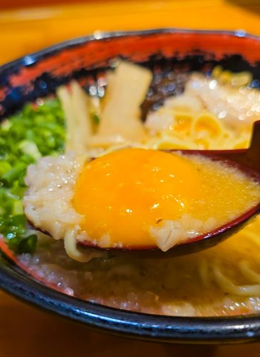 店主おすすめの「ぼんの~ラーメン(背脂焦がし醤油)」をオーダー。卵黄が2つ仲良く並んで入っています。※卵黄抜きもオーダー可。