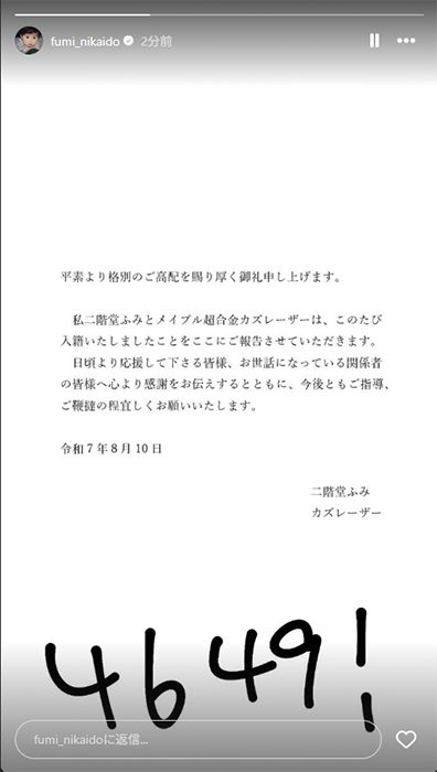二階堂さんの所属事務所のコメントでは「今後も変わらず活動を継続してまいりますので、引き続き温かいご支援を賜りますようお願い申し上げます」などと記している。