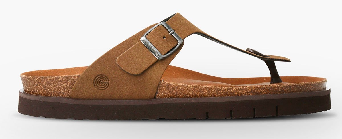 動物由来の素材不使用で、環境に配慮したサステナブルな背景を持つPETA認証ヴィーガン素材のトゥポストサンダル。軽量EVAアウトソールを採用し、調節可能なバックルで甲にしっかりフィットします。