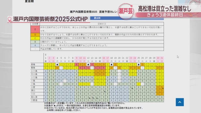 瀬戸芸の公式ホームページでは、島や港など12の会場の混雑予想カレンダーと当日の混雑状況を確認することができます。