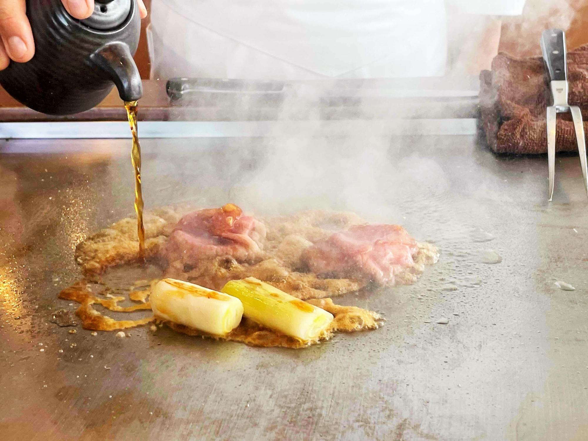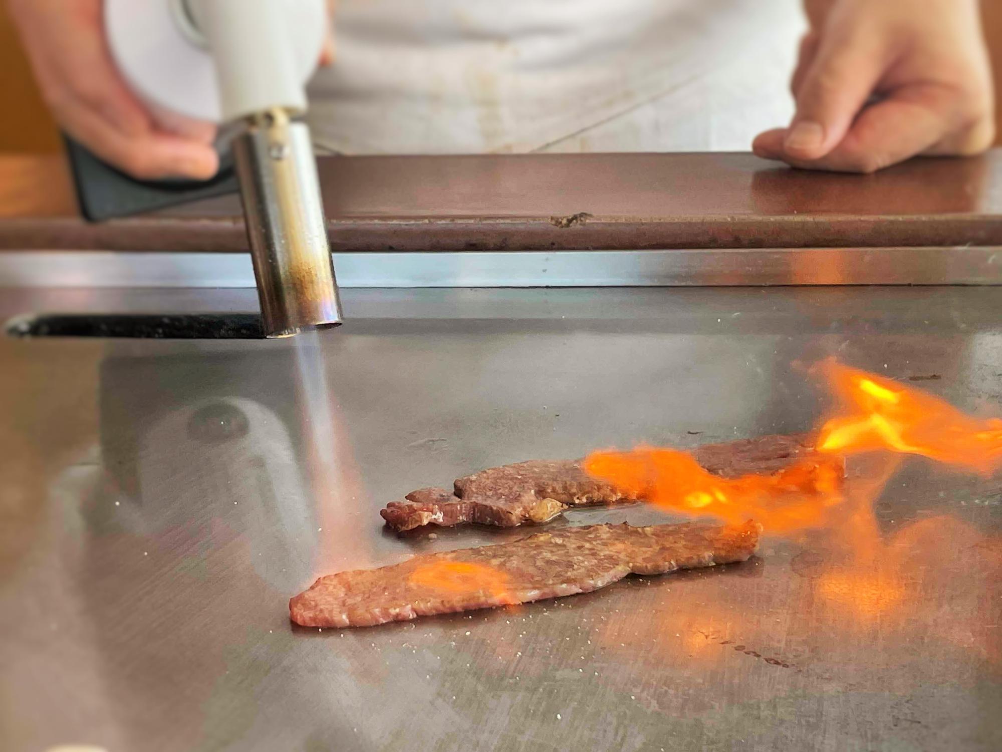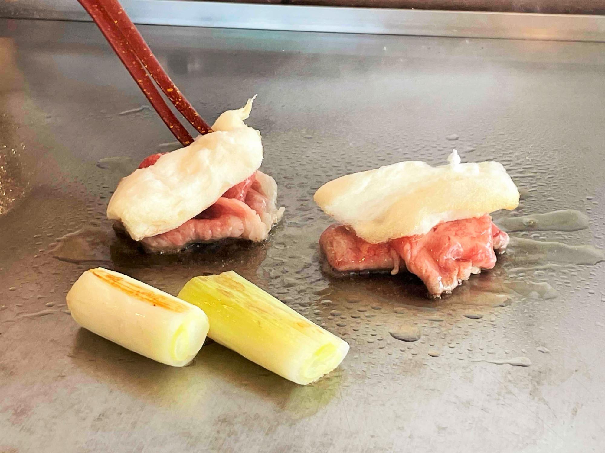 ところで、「大阪ウメビーフ」をご存じだろうか。梅酒の漬け梅や穀物を食べて育つ、日本全国でわずか40頭ほどしか流通しない希少なブランド牛だという。そんな説明を受けながら、目の前で調理が始まった。