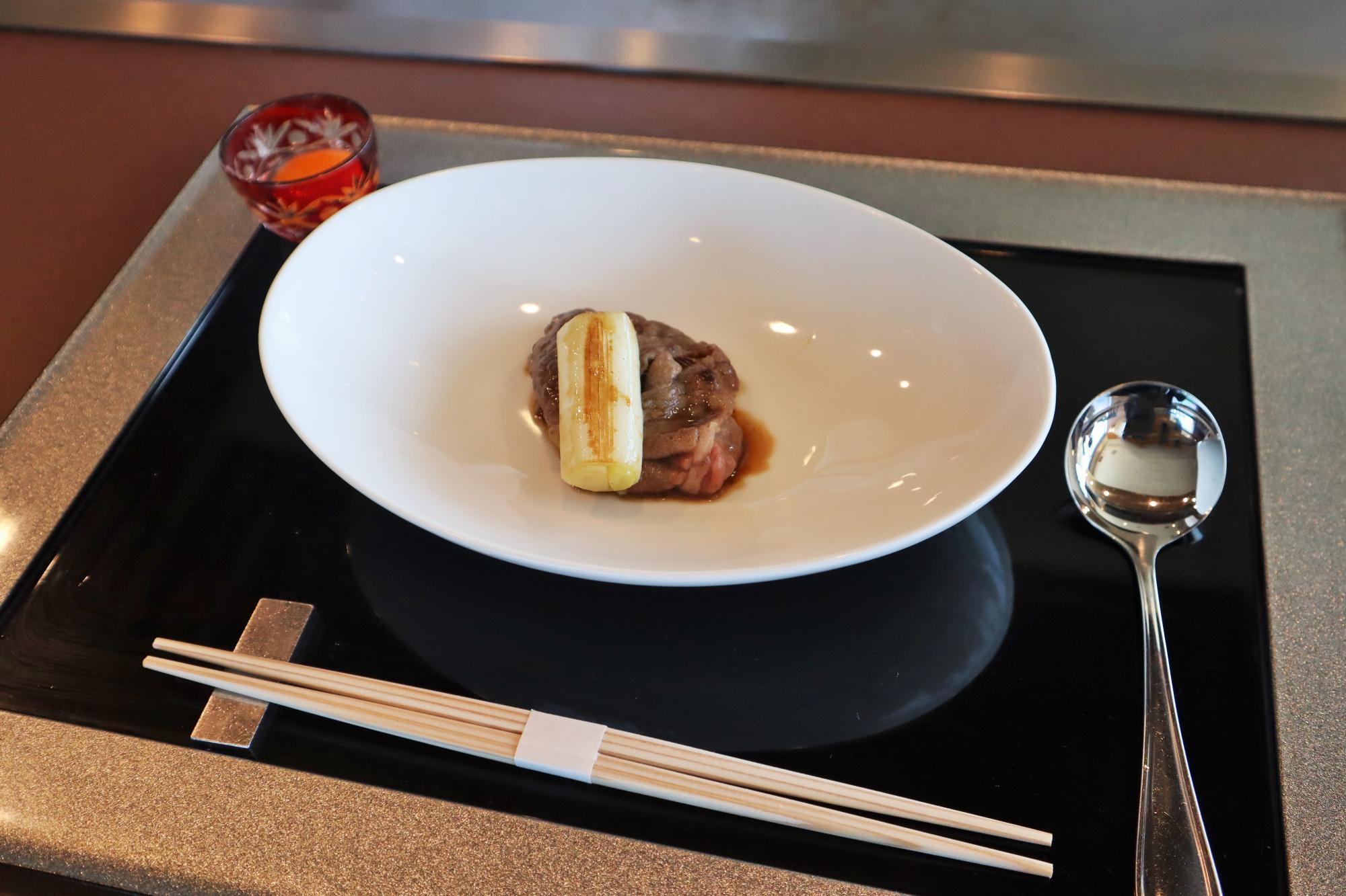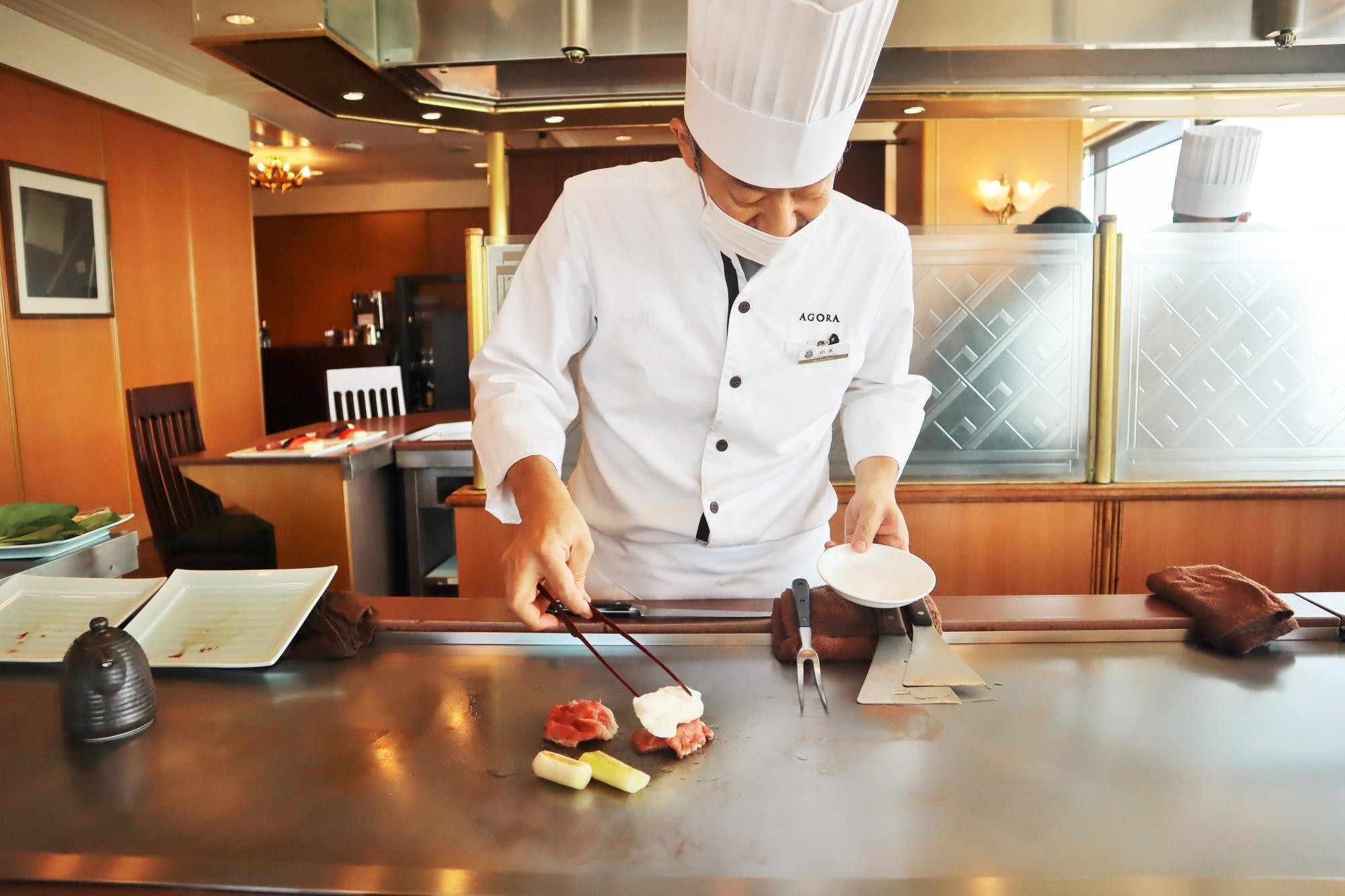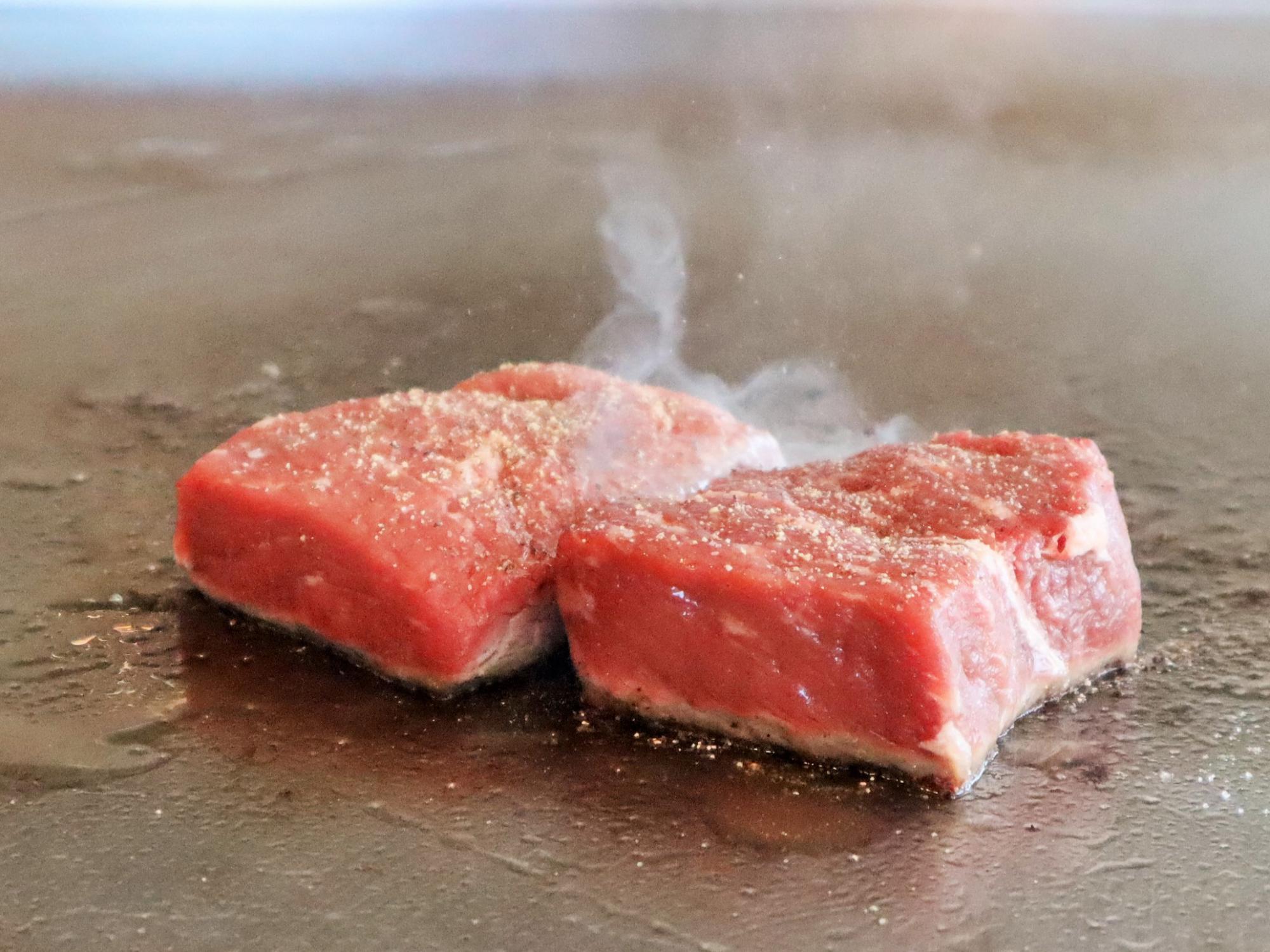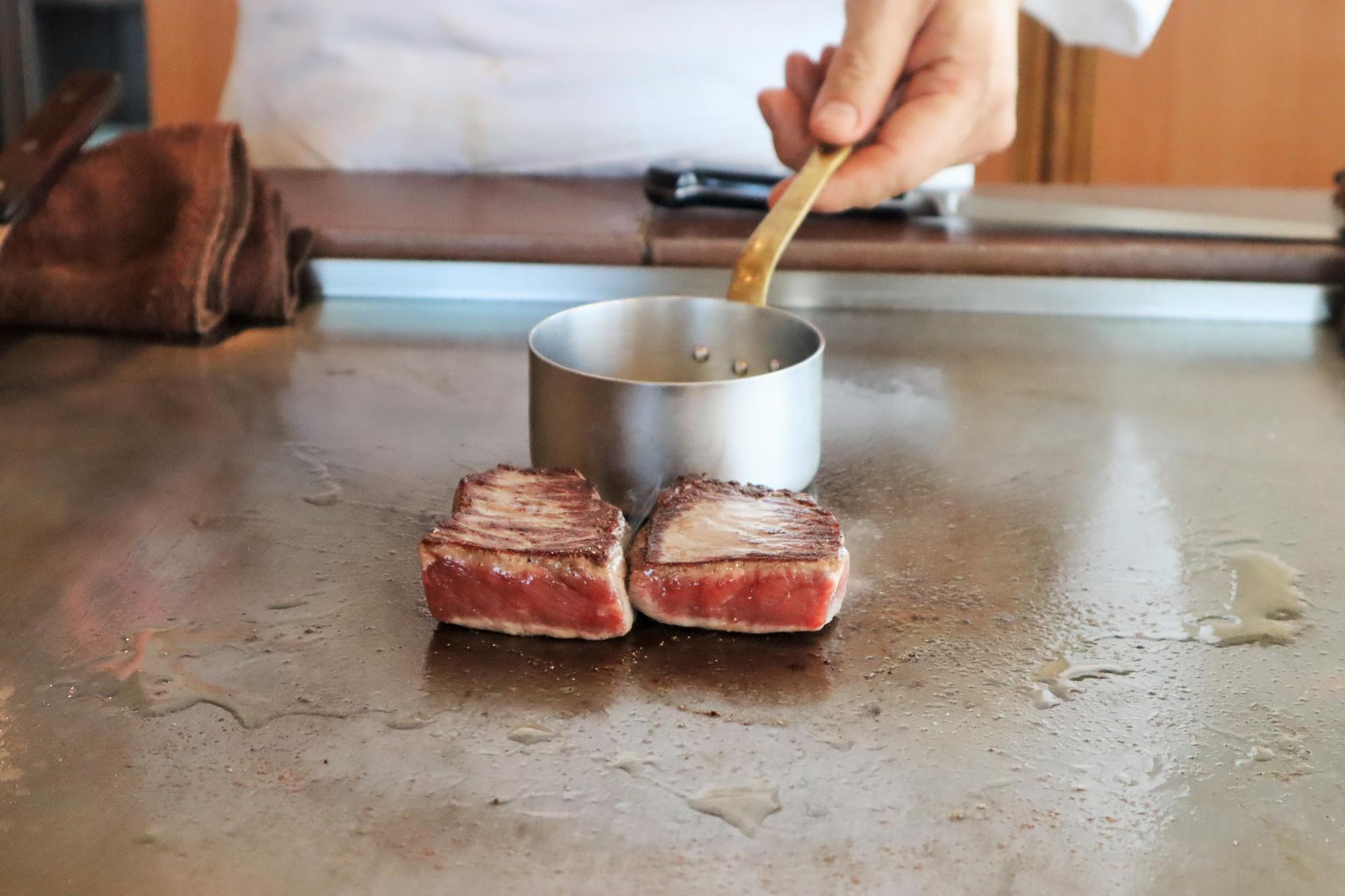 ところで、「大阪ウメビーフ」をご存じだろうか。梅酒の漬け梅や穀物を食べて育つ、日本全国でわずか40頭ほどしか流通しない希少なブランド牛だという。そんな説明を受けながら、目の前で調理が始まった。