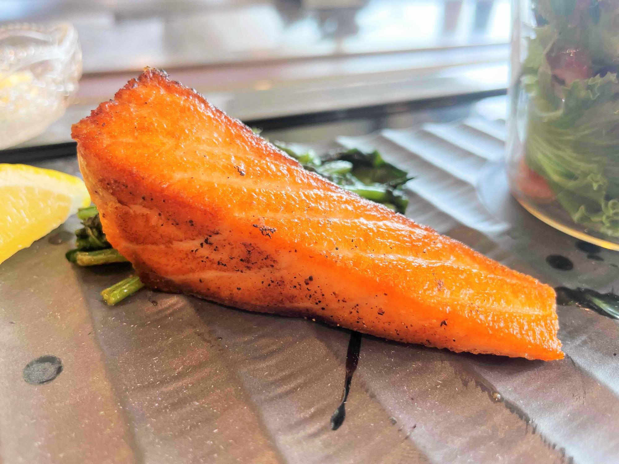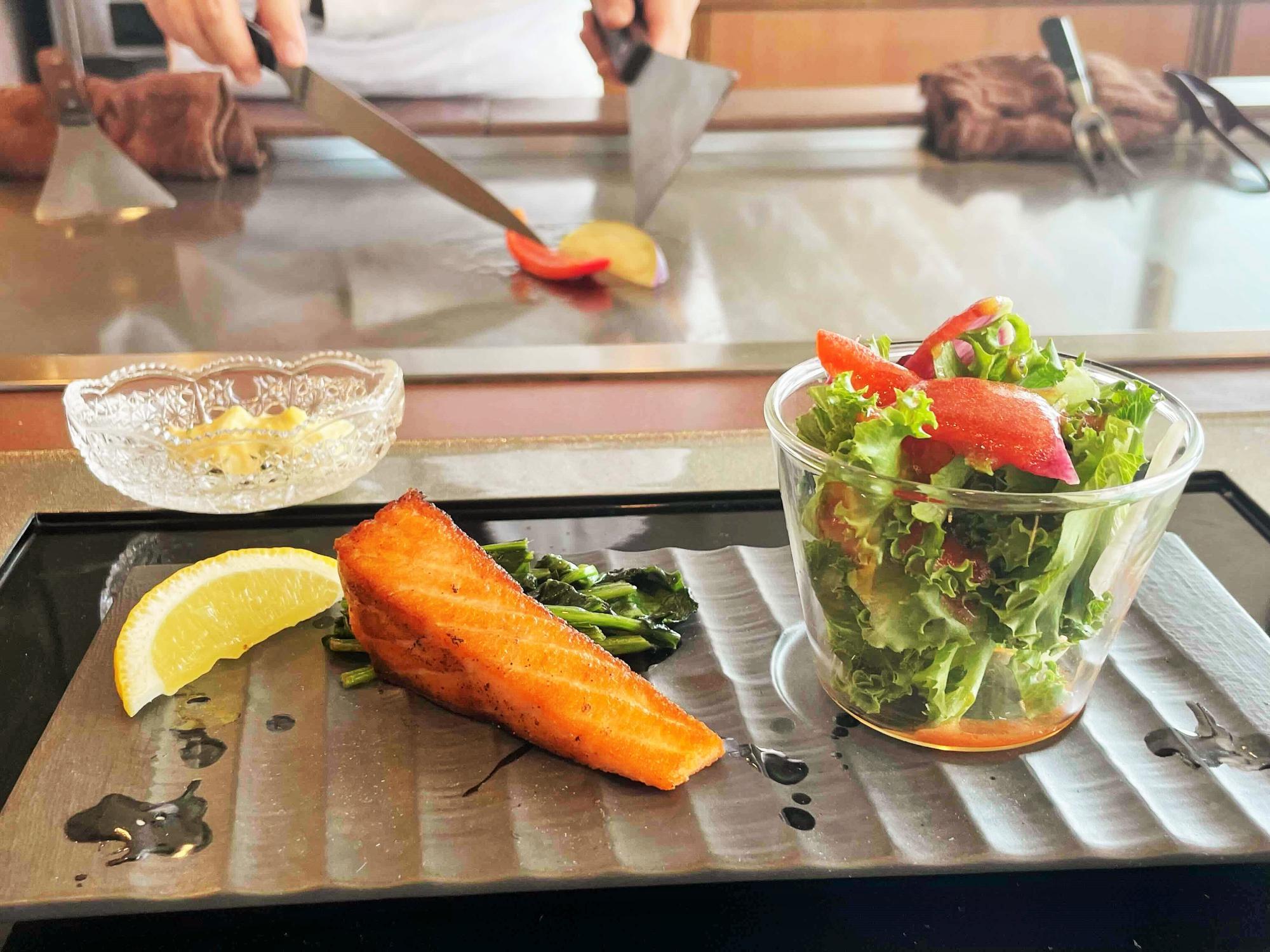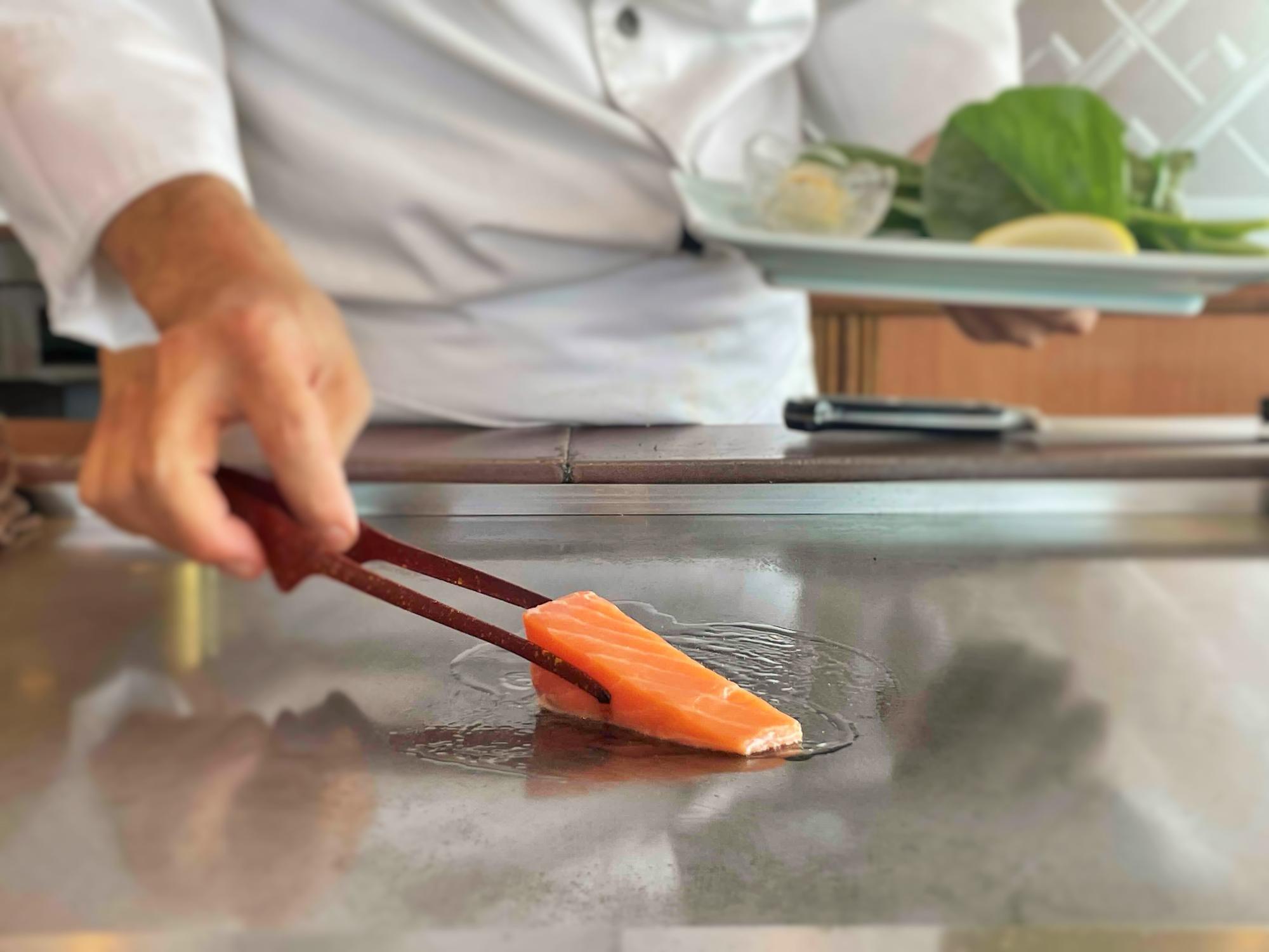 鉄板に置かれたサーモンは、じわじわと熱を帯び、まるで低温で少しずつ火が通っていくようだ。その様子は静と動のコントラストが際立ち、見ていて飽きない。
