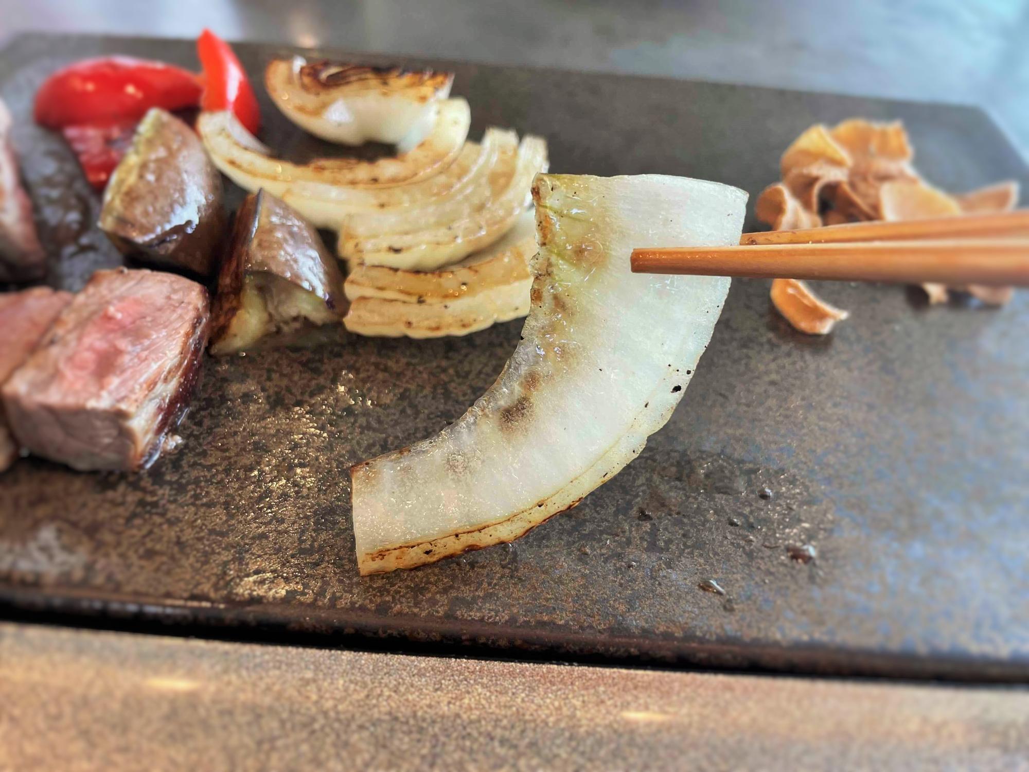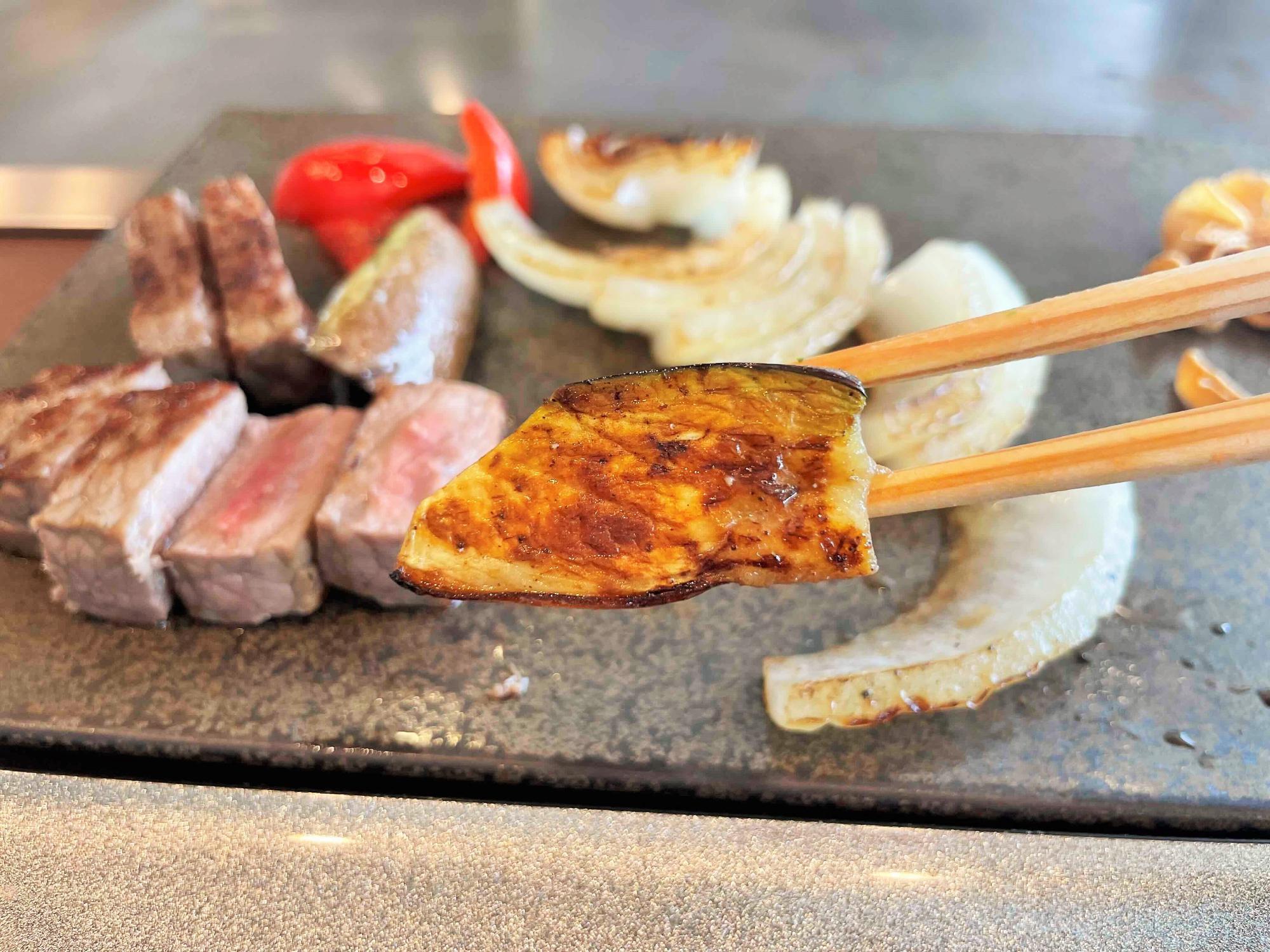 また、「泉州水ナス」を鉄板で焼くという調理法にも驚かされた。みずみずしさがほどよく残り、香ばしさと甘みが引き立って、本当に美味しい。