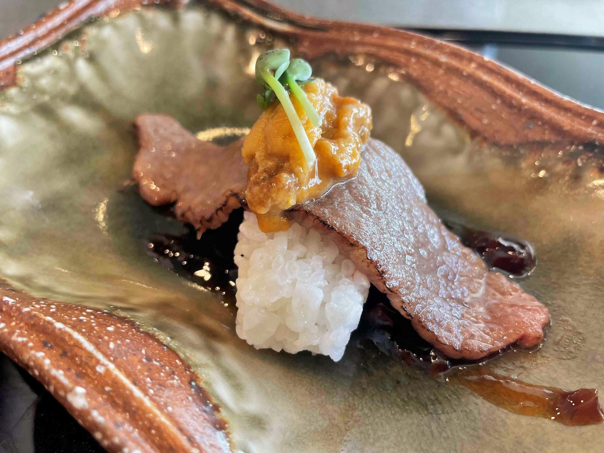 なんと、雲丹をのせた「大阪ウメビーフの肉寿司 -雲丹添え 紀州梅の香りとともに」。見た瞬間から贅沢さが伝わってくる一品だ。