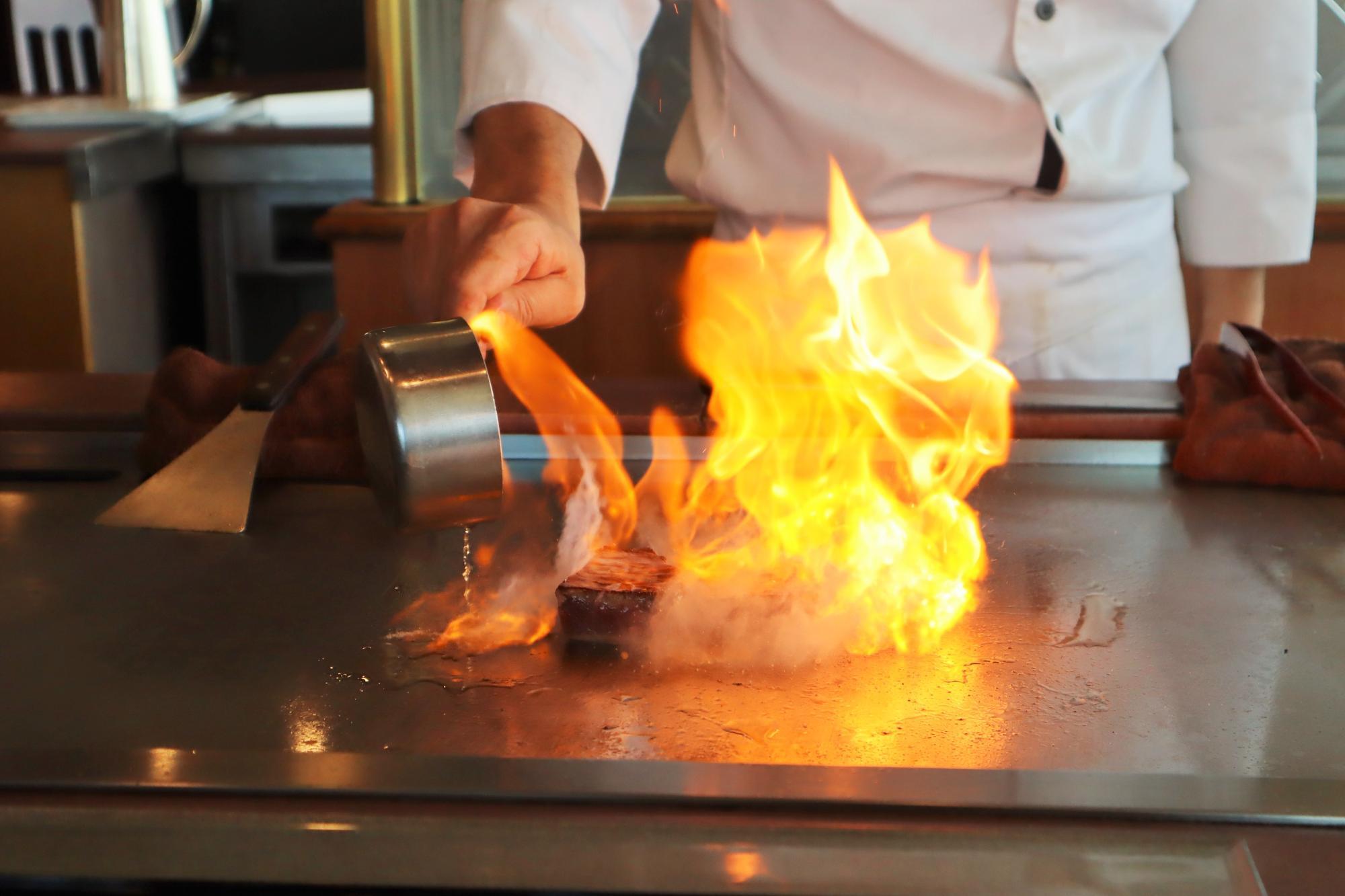 アメリカ産牛サーロインの調理が始まると、シェフが再び「もうすぐシャッターチャンスですよ。写真を撮るなら準備してくださいね」と声をかけてくれた。