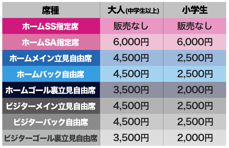 ※「ホームメイン立見自由席」「ホームゴール裏立見自由席」「ビジターメイン立見自由席」「ビジターゴール裏立見自由席」は立ち見席となります。