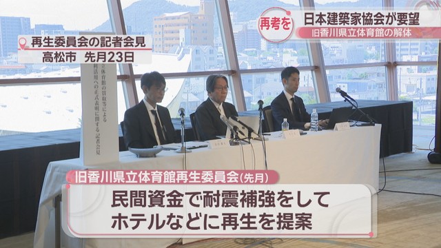 7月、建築家らでつくる旧香川県立体育館再生委員会が民間の資金で耐震補強をしてホテルなどに再生することを提案しました。しかし香川県教委は「具体的な計画などが明確になっていない」などとして協議に応じませんでした。