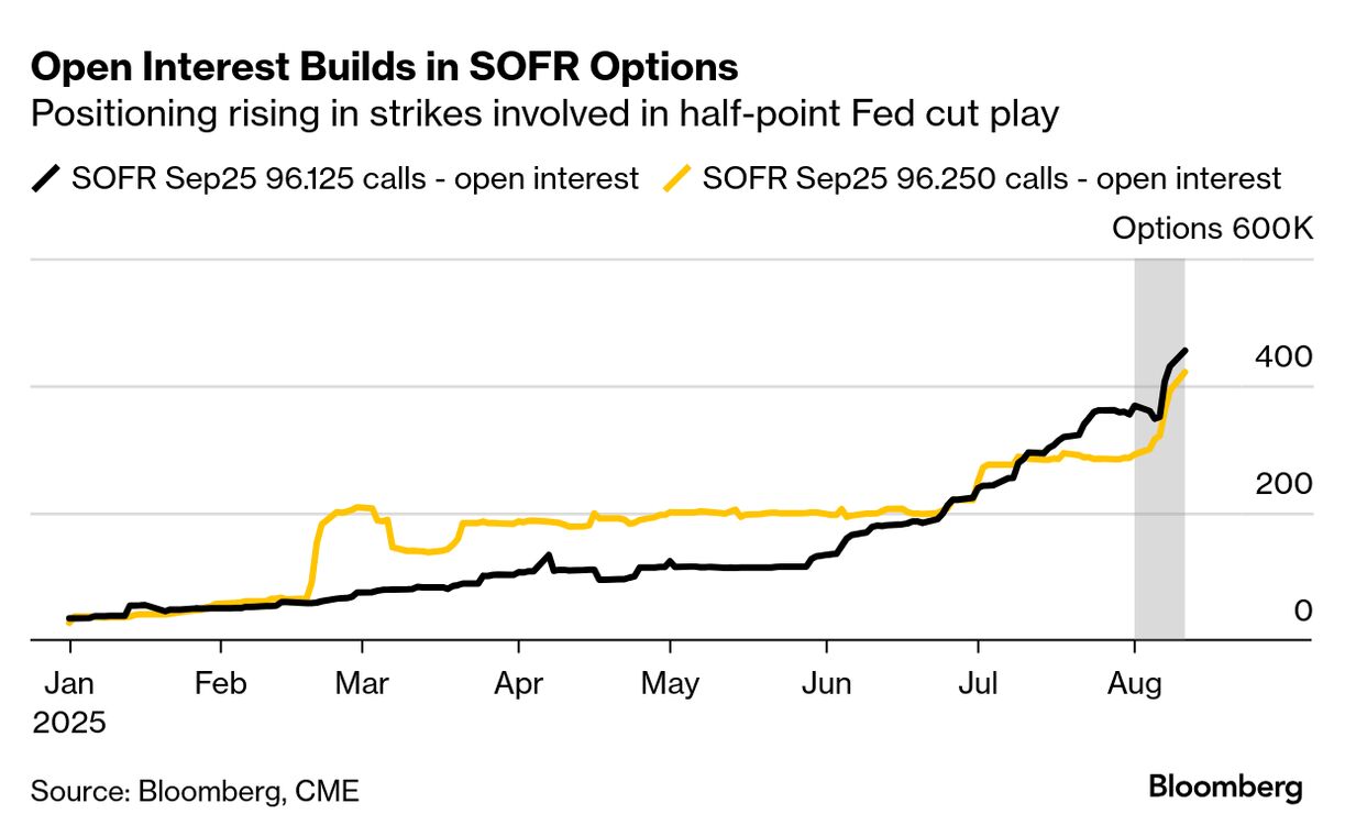 9月に0.25ポイント超の利下げを見込む動きもこの日に勢いを増し、予想通りとなった場合に利益が得られる担保付翌日物調達金利(SOFR)関連のポジションに、約200万ドル(約2億9600万円)のプレミアムが積み増された。