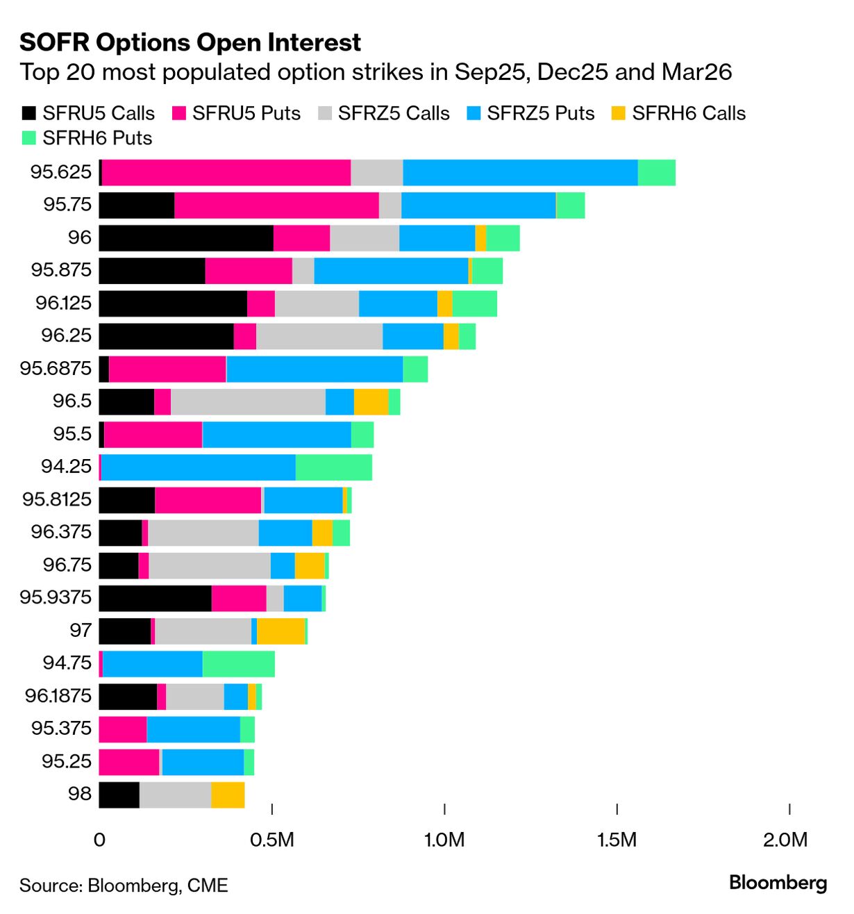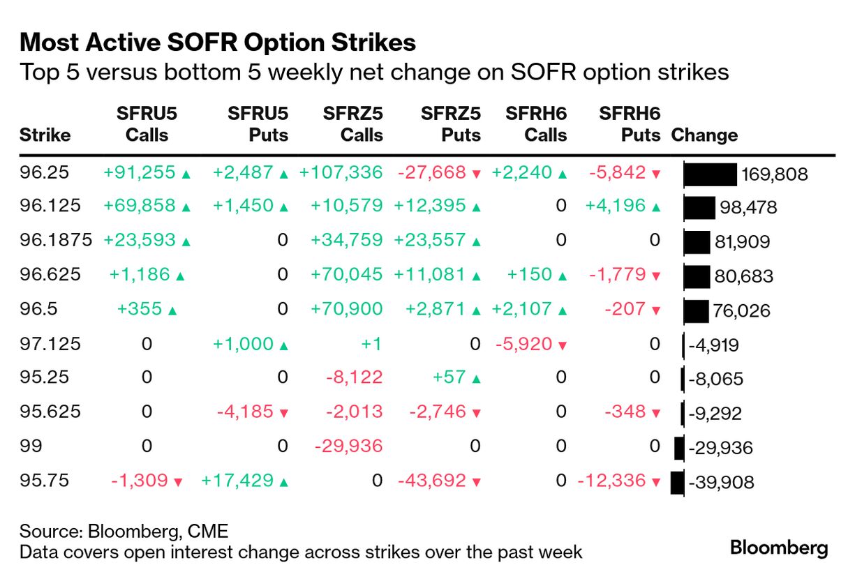 ただ現時点では連邦準備制度のハト派姿勢に賭ける動きが目立つ。SOFR先物9月限に関連するオプション取引は、9月に0.5ポイントの利下げが織り込まれれば最大4000万ドルの利益が得られる可能性があるとブルームバーグは試算している。