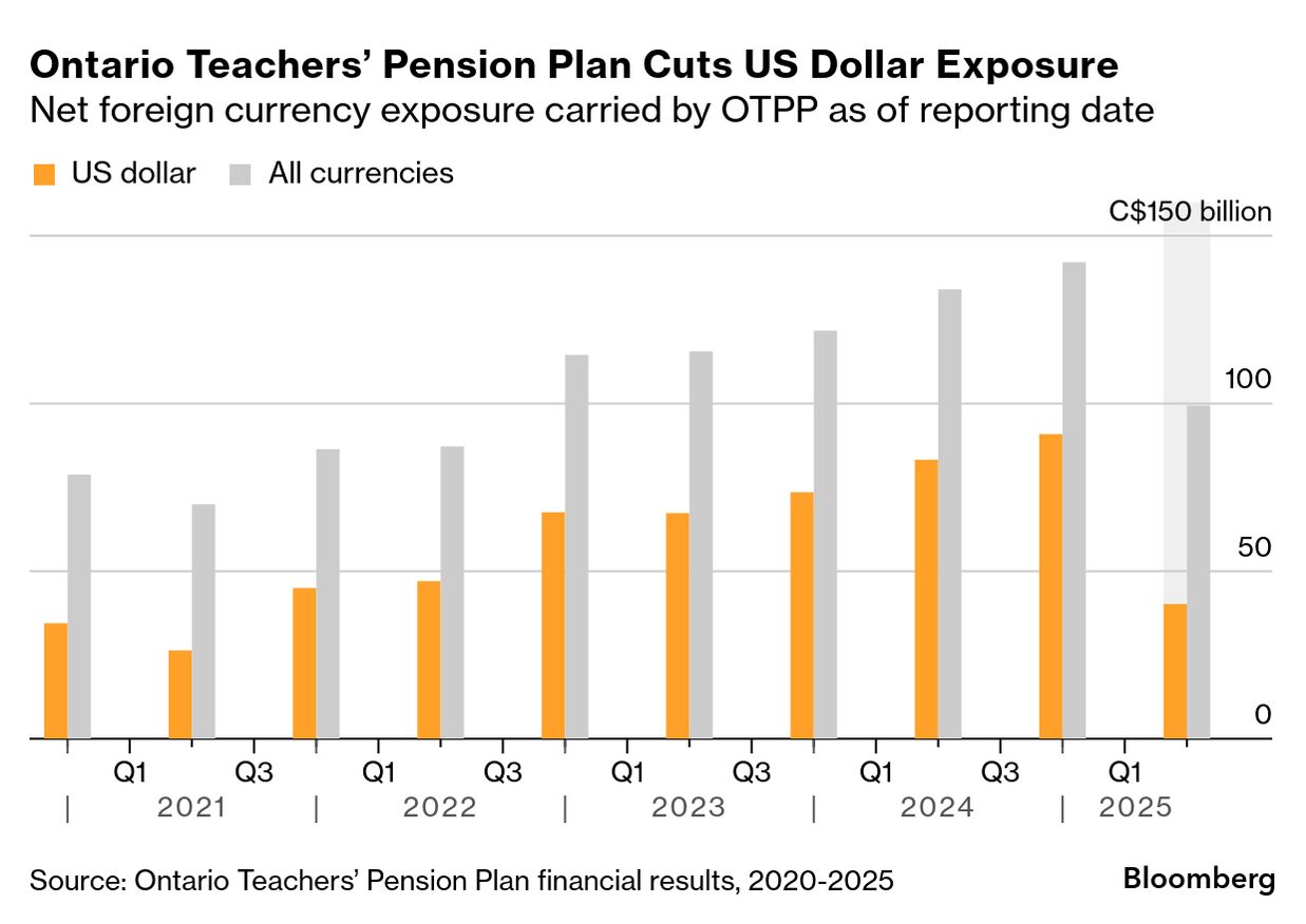 カナダのオンタリオ州教職員年金基金(OTPP)は、2025年1-6月(上期)に米ドル資産へのエクスポージャーを56%圧縮した。カナダ・ドルの対米ドル相場上昇に対応した。