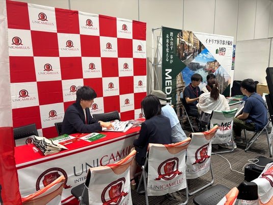 MED ITALY株式会社(所在地:東京都港区、代表:近藤 晋一郎)は、2025年7月21日(月・祝)に大阪・OMM展示ホールで開催された、日本経済新聞社主催 「医学部進学フォーラム 2025 Summer 大阪会場」にイタリアの医療系大学ユニカミラス大学(正式名称:Unicamillus University)と共同でブース出展いたしました。日本の「医学部進学フォーラム」にイタリアの大学が参加したのはユニカミラス大学が初めてとなります。本イベントでは、関西圏を中心とした多数の高校生・保護者が来場し、イタリアの英語医学部進学に対する関心の高さがうかがえました。