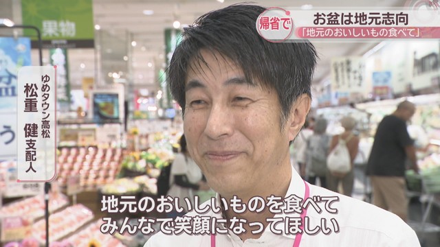 お盆を帰省先などで過ごす人に向け、ゆめタウン高松では「地元志向」をキーワードに、果物や野菜などは半分以上を地元から仕入れています。