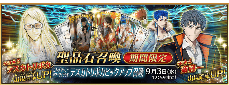 期間限定で「★5(SSR)テスカトリポカ」「★4(SR)斎藤一」「★3(R)クー・フーリン(キャスター)」と、期間限定概念礼装3種をピックアップした聖晶石召喚を開催いたします。