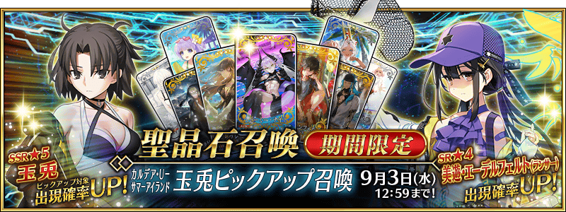 期間限定で「★5(SSR)玉兎」「★4(SR)美遊・エーデルフェルト(ランサー)」と、期間限定概念礼装6種をピックアップした聖晶石召喚を開催いたします。