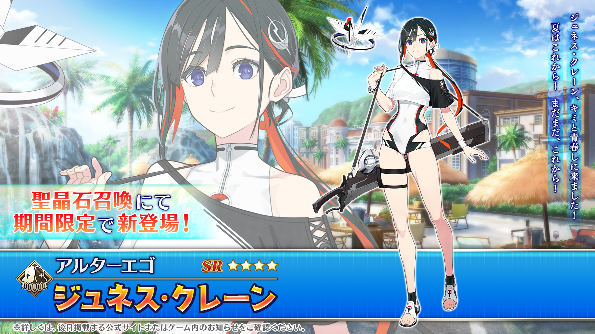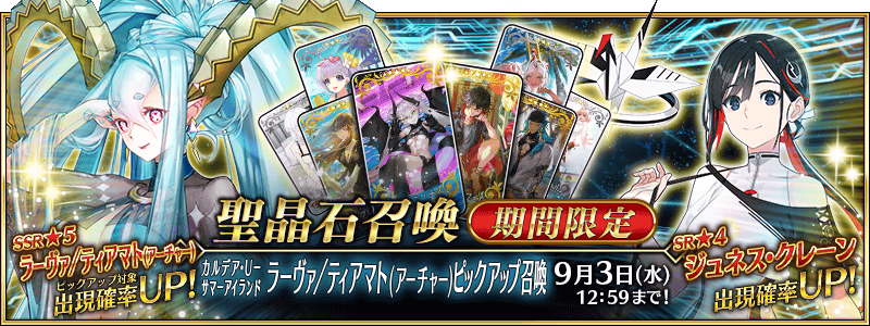 期間限定で「★5(SSR)ラーヴァ/ティアマト(アーチャー)」「★4(SR)ジュネス・クレーン」と、期間限定概念礼装6種をピックアップした聖晶石召喚を開催いたします。