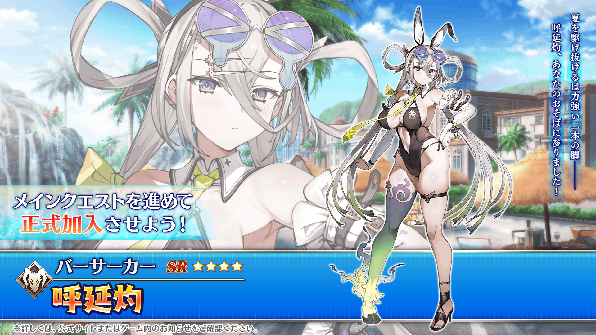 期間限定イベント「カルデア・U-サマーアイランド ~大統領は夏の夢を見るか?~」のメインクエストを進めることで、イベント限定の配布サーヴァント「★4(SR)呼延灼(バーサーカー)」を正式加入させることができます。