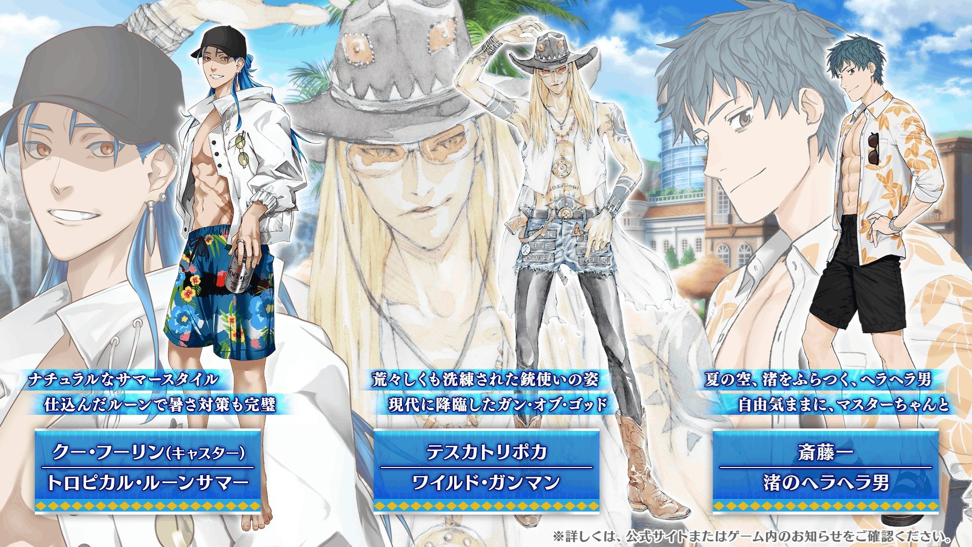 期間限定イベント「カルデア・U-サマーアイランド ~大統領は夏の夢を見るか?~」のイベントアイテム交換にて、「★5(SSR)テスカトリポカ」「★4(SR)斎藤一」「★3(R)クー・フーリン(キャスター)」の霊衣開放権を入手できます。