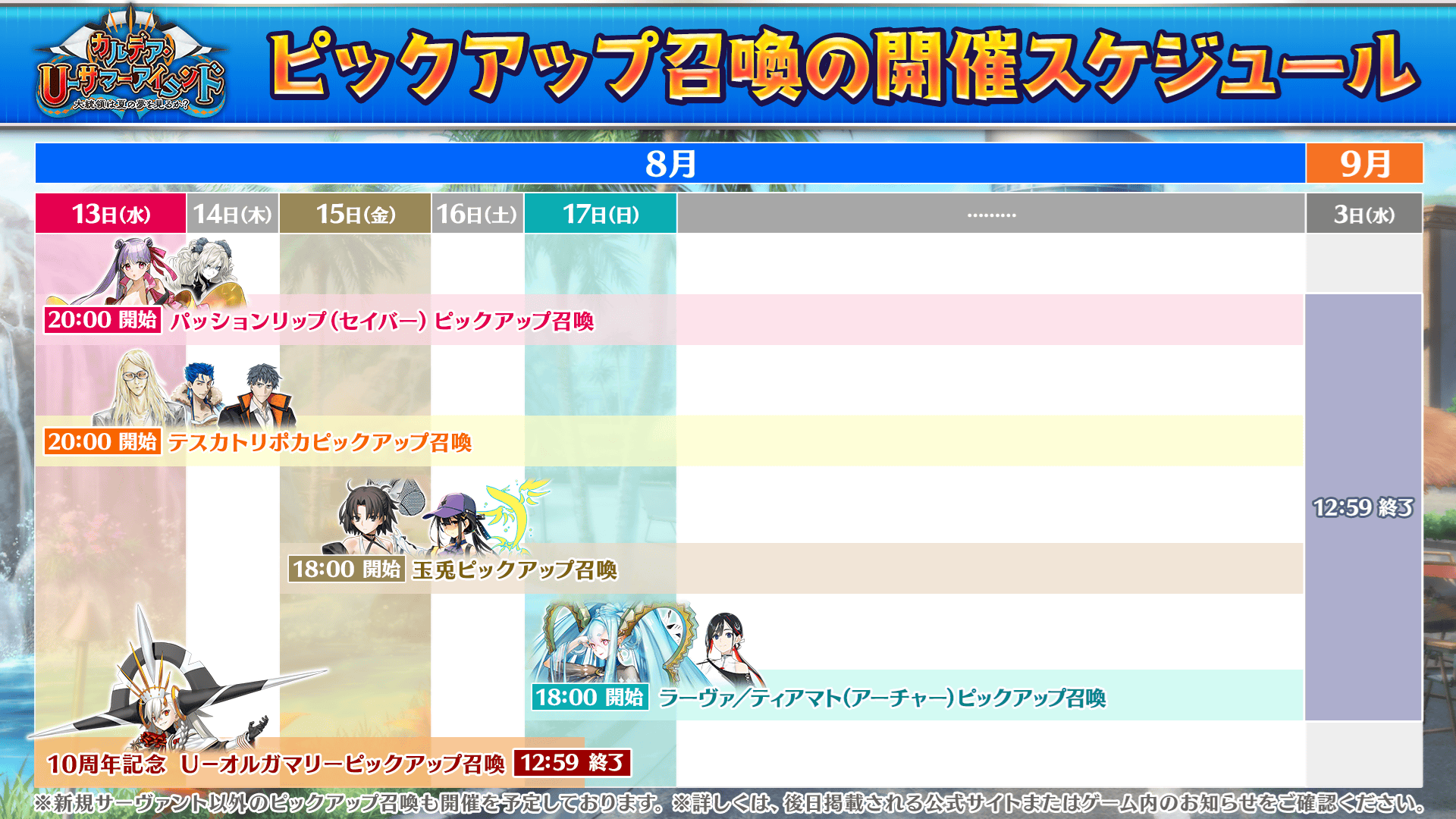 期間限定イベント「カルデア・U-サマーアイランド ~大統領は夏の夢を見るか?~」のピックアップ召喚のスケジュールは以下になります。