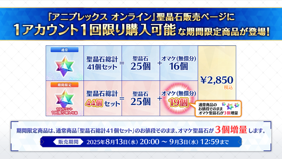 ◆『アニプレックス オンライン』聖晶石販売ページに、1アカウント1回限り購入可能な期間限定商品が登場!◆
