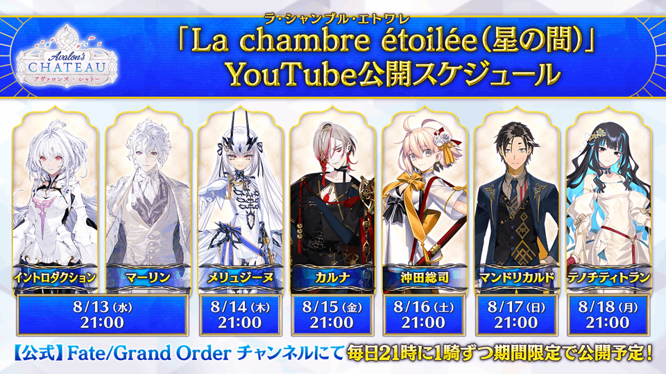 【公式】Fate/Grand Order チャンネルにて毎日21時に1騎ずつ期間限定で公開予定です。