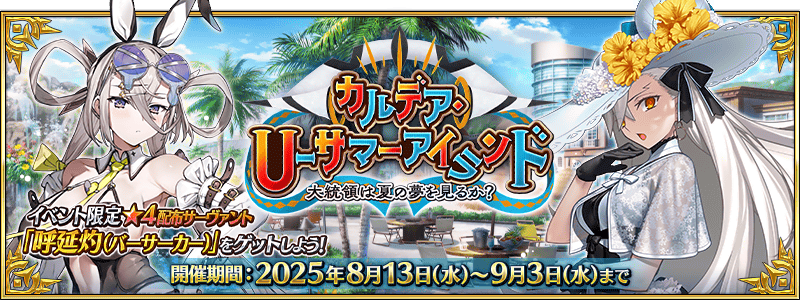 期間限定イベント「カルデア・U-サマーアイランド ~大統領は夏の夢を見るか?~」が2025年8月13日(水) 20:00より開幕することを発表いたしました。
