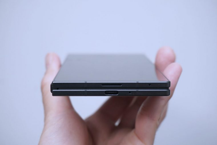 本体を開いた状態では約4.2mmです。Fold6は約5.6mmでした。参考までに、M4搭載iPad Pro 11インチモデルの約5.3mmよりもだいぶ薄いです。Z Fold7はFold6に比べると24g軽くなりました。質量は215g。閉じた状態での片手持ち操作も軽快にできます。こちらも参考までに、6.9インチのiPhone 16 Pro Maxの質量は約227gです。
