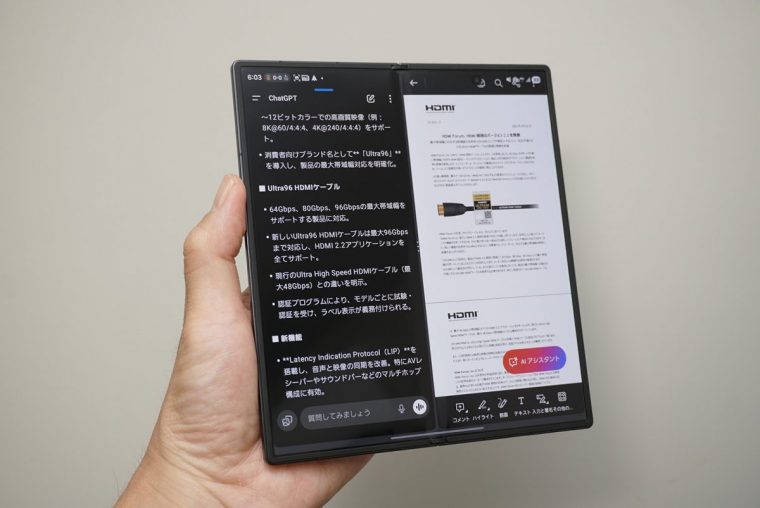 Z Fold7はメインディスプレイ側に2画面・3画面表示で別々のアプリを立ち上げることができます。左右のスプリット表示にして、左側にAcrobatリーダーでPDFの原文を表示して、右側でChatGPTに生成してもらった要約を見ながら資料を読み込む使い方も可能です。このあたりは、フォルダブルスマホならではの良さをおおいに実感できる部分でしょう。