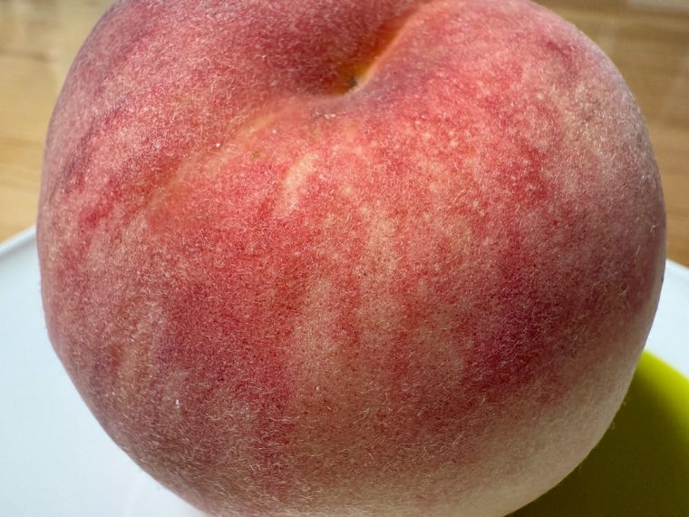 ↑参考までに、iPhone 16 Proで撮影した同じ桃の表皮。写真の色合いはiPhoneの方が温かみ重視のバランスです。