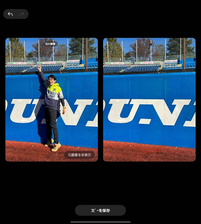 ↑生成AI編集で写真の人物を消去。左右に編集前後の写真を並べて仕上がり具合が比べられるようになりました。