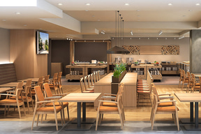 朝食ビュッフェは、ます寿司やほたるいかのかき揚げ、白エビを使用した一品料理、富山ブラックカレー、たら汁など、富山の産品を味わえる和洋メニューが揃う。