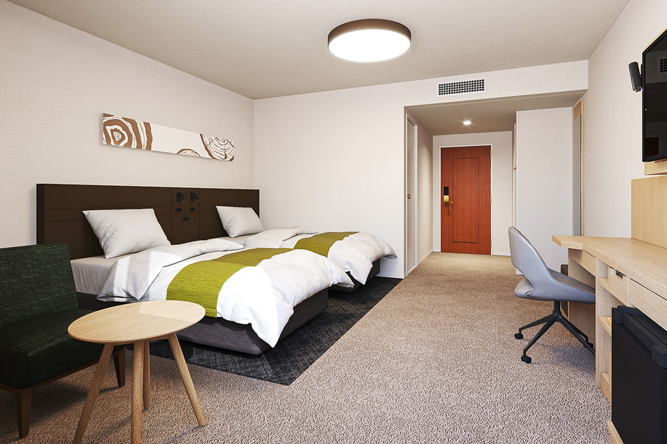 ホテルエノエは2024年10月に北海道・函館に1号店を開業した新しいブランドで、北陸へは初進出。施設内は木目を基調にした温かみのある内装を採用し、客室はダブル171室、ツイン46室、トリプル9室、ユニバーサル1室の4タイプを用意した。ベッドマットレスはサータ製、無料Wi-Fi、温水洗浄便座、加湿機能付き空気清浄機、テレビを備え、アメニティの歯ブラシやヘアブラシ、カミソリにはバイオマス商品を取り入れた。