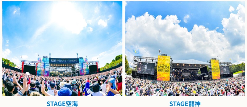 大きな特徴が「空海」「龍神」2つのメインステージで、交互にライブをおこなうスタイル。芝生広場にいるだけで、2つのメインステージのアーティストを網羅することができます。そのほかにも、物販やフードとともにステージを楽しめる「MONSTERcircus」「MONSTERcircus+」、アコースティックを中心とした「STAGE茶堂」もあり、さまざまなスタイルでフェスを楽しめます。