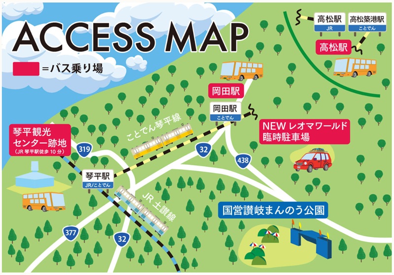 「MONSTER baSH 2025」の会場、国営讃岐まんのう公園は「JR高松駅」からはシャトルバスで約1時間。「JR琴平駅からは徒歩約10分の「琴平観光センター跡地」からシャトルバス約30分です。「ことでん岡田駅」からはシャトルバス約20分でアクセスできます。