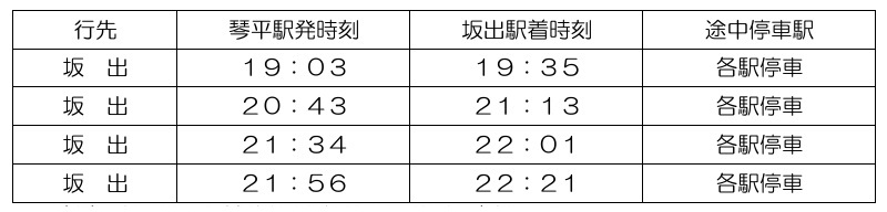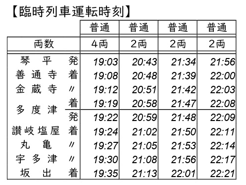 臨時列車はいずれも各駅停車で、19:03、20:43、21:34、21:56琴平駅発の4本。多度津駅で特急に、坂出駅で快速に乗り換えが可能です。