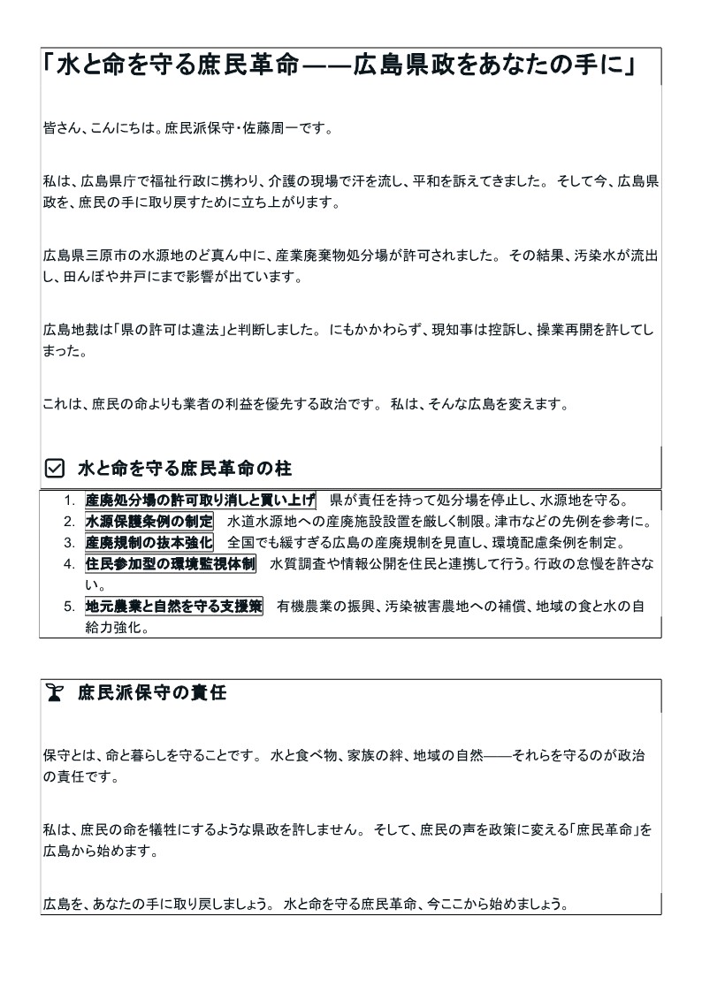 私は、命の水を守るために立ち上がりました。 水源保全条例の制定、PFAS規制の強化、処分場の許可取り消し―― 県民の命と暮らしを守る政治に、広島を変えていきます。