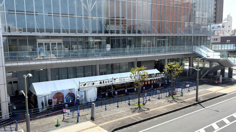 物販は13時半からですが、12時頃で既にマリナート東側にズラリと列ができていました。19時までは当日チケット所持者限定販売、19時以降は無しで利用可能とのこと。
