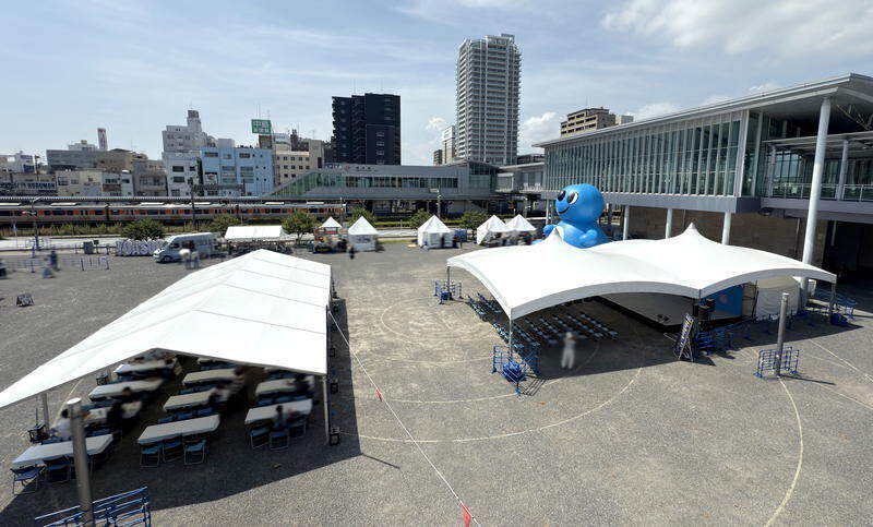 東口の階段を下りた南側、マリナートとの間の広場が会場。WANPAKU MATSURIも夜祭しみずも区切りなく広場内にブース出展の形となっており、自由に出入りできます。